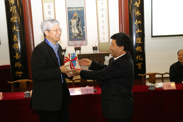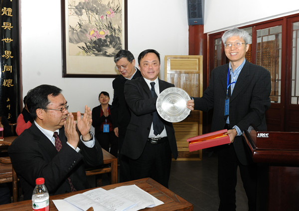 中国人民大学哲学院院长姚新中教授向贵州大学人文学院、中国文化书院赠送纪念盘 贵州大学人文学院院长庄勇教授代表学院及书院接受赠品