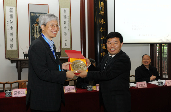 贵州大学党委副书记骆长江向中国人民大学赠送中国文化书院纪念盘