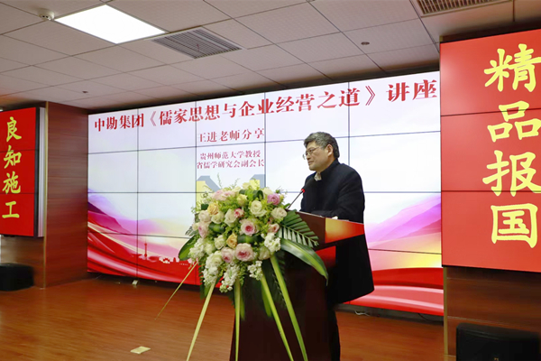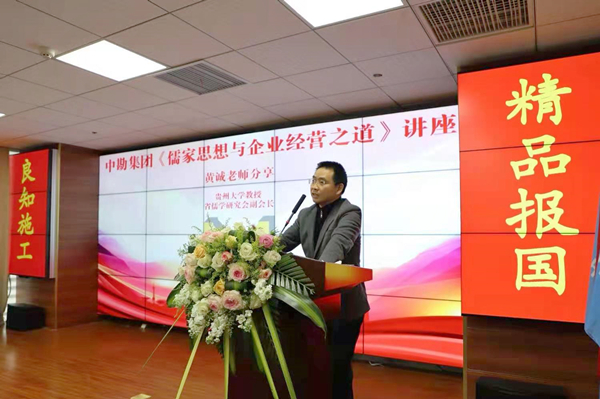 张新民会长在主旨演讲中首先指出,文化具有重要的历史社会功能,可以用来治边疆、治理企业和治理国家;从历史维度来看,边疆最稳定的地区一定是中国文化扎根最深的地区,一定也是儒家文化传播最广、最深和儒家人文价值理念最深入人心的地区;其次,他指出,儒释道三家是中国传统文化的三大支柱或主题,而古代的治国实践中乃是以儒家为主干并辅以释道为两翼的文化治国之道;再次,他回顾了儒学产生的历史背景,指出轴心时代的东方中国孔子创立了儒学并开启了一套适宜于中国本土性的文化伦理系统和人文价值理念,且特别强调了“善”和“仁爱”精神,即个人的完善一定要与社会的伦理承担打成一片,要正常处理人与人、人与社会、人与天地自然的关系;最后,他结合企业实际情况,勉励企业员工要学习优秀的传统文化,吸取文化思想资源并涵养自身的文化精神气象,力做一个堂堂正正的君子。