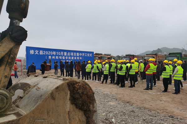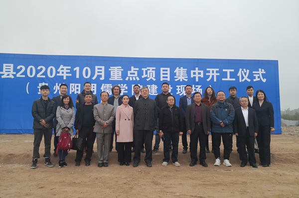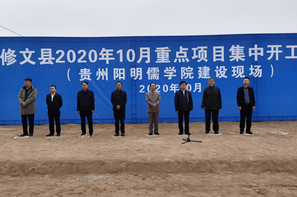 2020年10月9日上午,贵州省贵阳市修文县10月重点项目集中开工仪式在贵州阳明儒学院项目建设点举行。修文县委书记孙华忠出席仪式并宣布项目开工。县人大常委会主任张江华、县政协主席王世利等县四大班子领导,贵州大学中国文化书院荣誉院长、贵州省儒学研究会会长张新民教授,贵州阳明儒学院管理有限公司董事长周北辰及项目施工单位、县直有关部门、乡(镇、街道)及平台公司有关人员参加开工仪式。县委副书记陈祖发主持仪式。