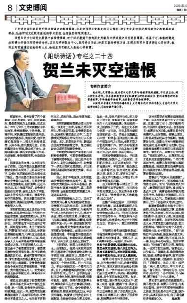 2020年10月18日《贵阳晚报》第a08版“文史博阅”刊载贵州大学文学与传媒学院副教授、中文系主任,贵州省《红楼梦》研究会副会长、贵州省儒学研究会常务理事、贵州大学中华传统文化与贵州地域文化研究中心兼职研究员赵永刚博士“《阳明诗话》专栏之二十四:贺兰未灭空遗恨”。编者按及全文如下: