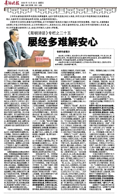 2020年10月23日《贵阳晚报》第a13版“文史博阅”刊载贵州大学文学与传媒学院副教授、中文系主任,贵州省《红楼梦》研究会副会长、贵州省儒学研究会常务理事、贵州大学中华传统文化与贵州地域文化研究中心兼职研究员赵永刚博士“《阳明诗话》专栏之二十五:屡经多难解安心”。编者按及全文如下: